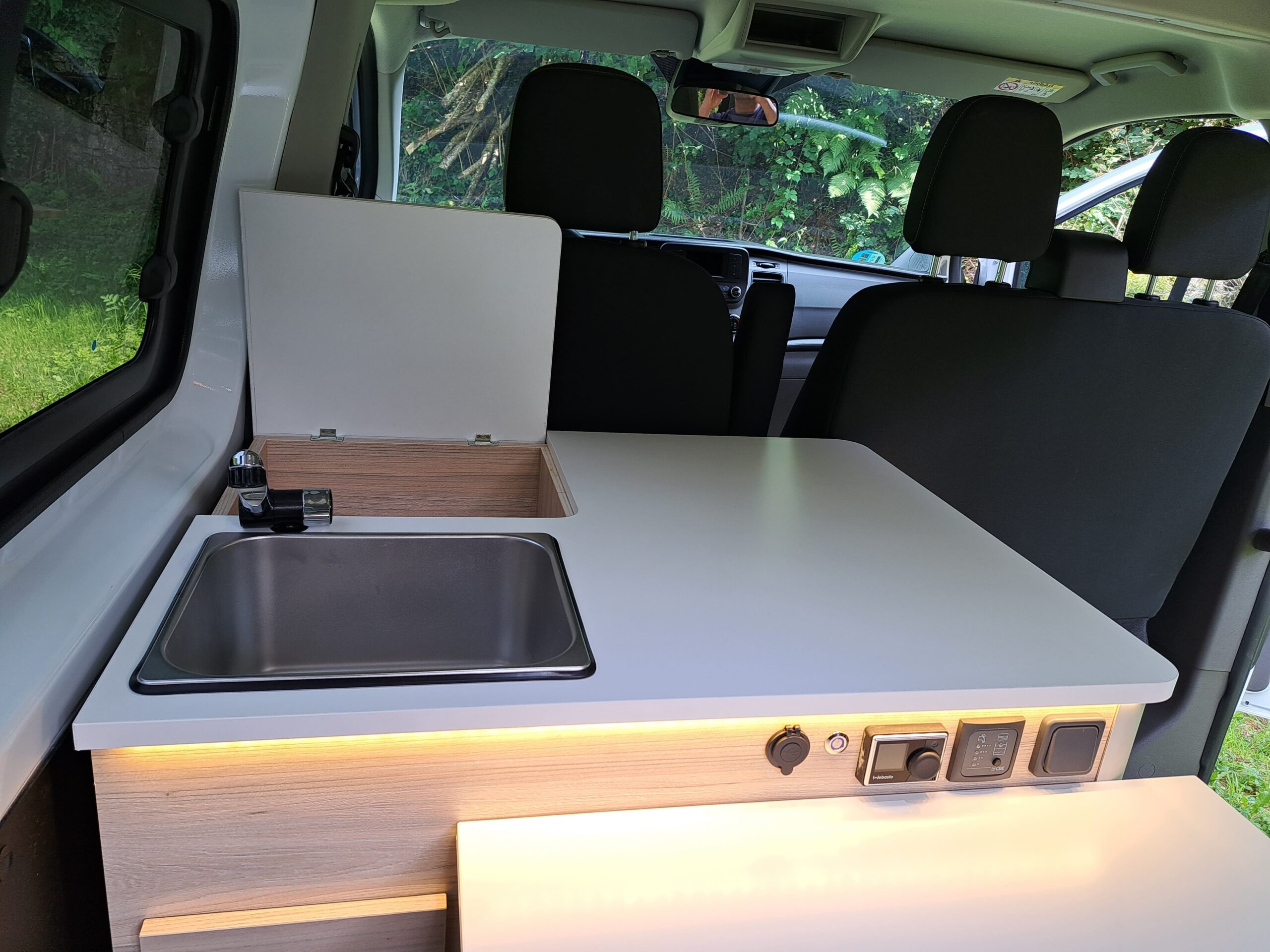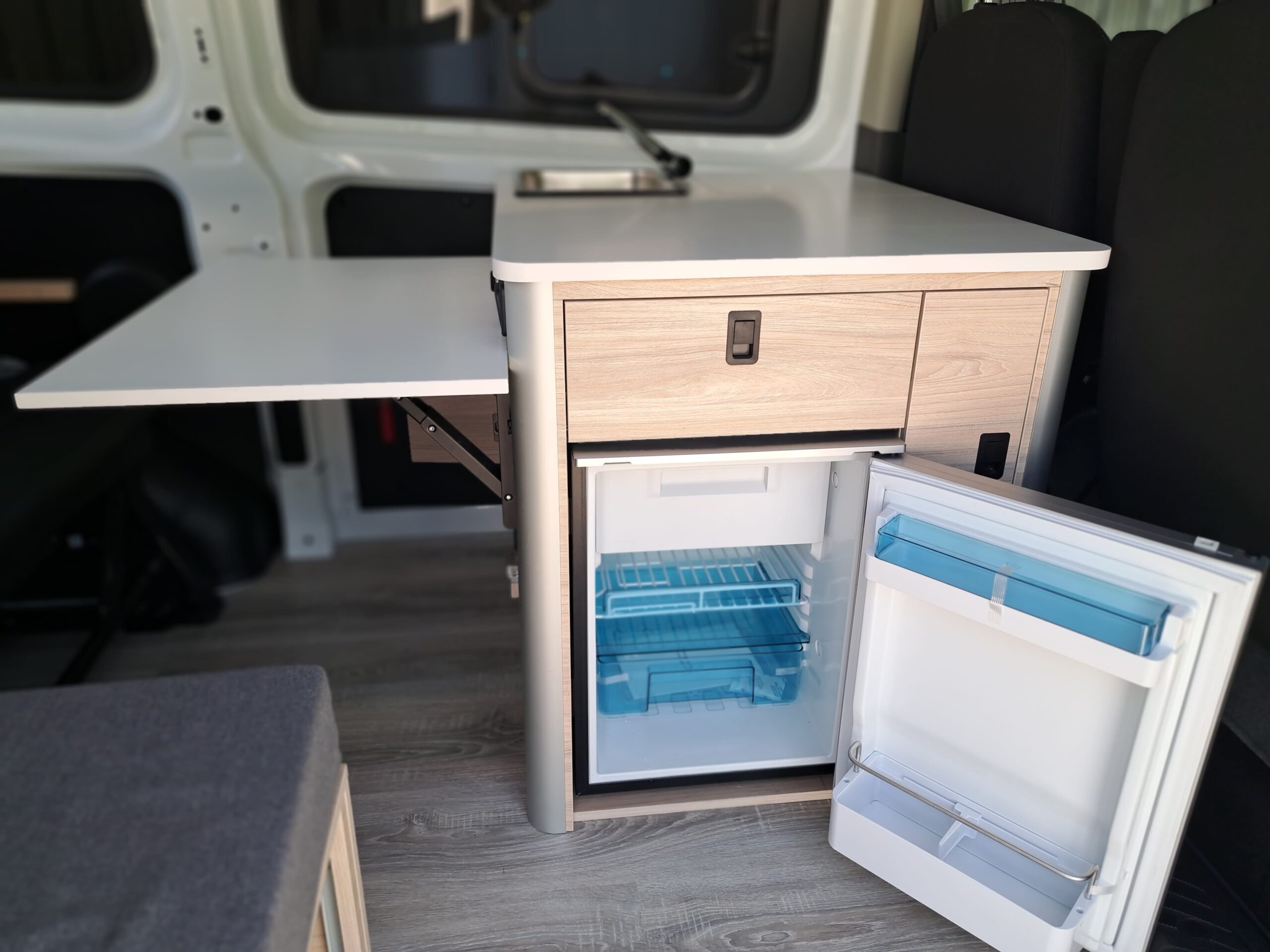 Mueble delantero con mesa abatible y huecos para almacenaje